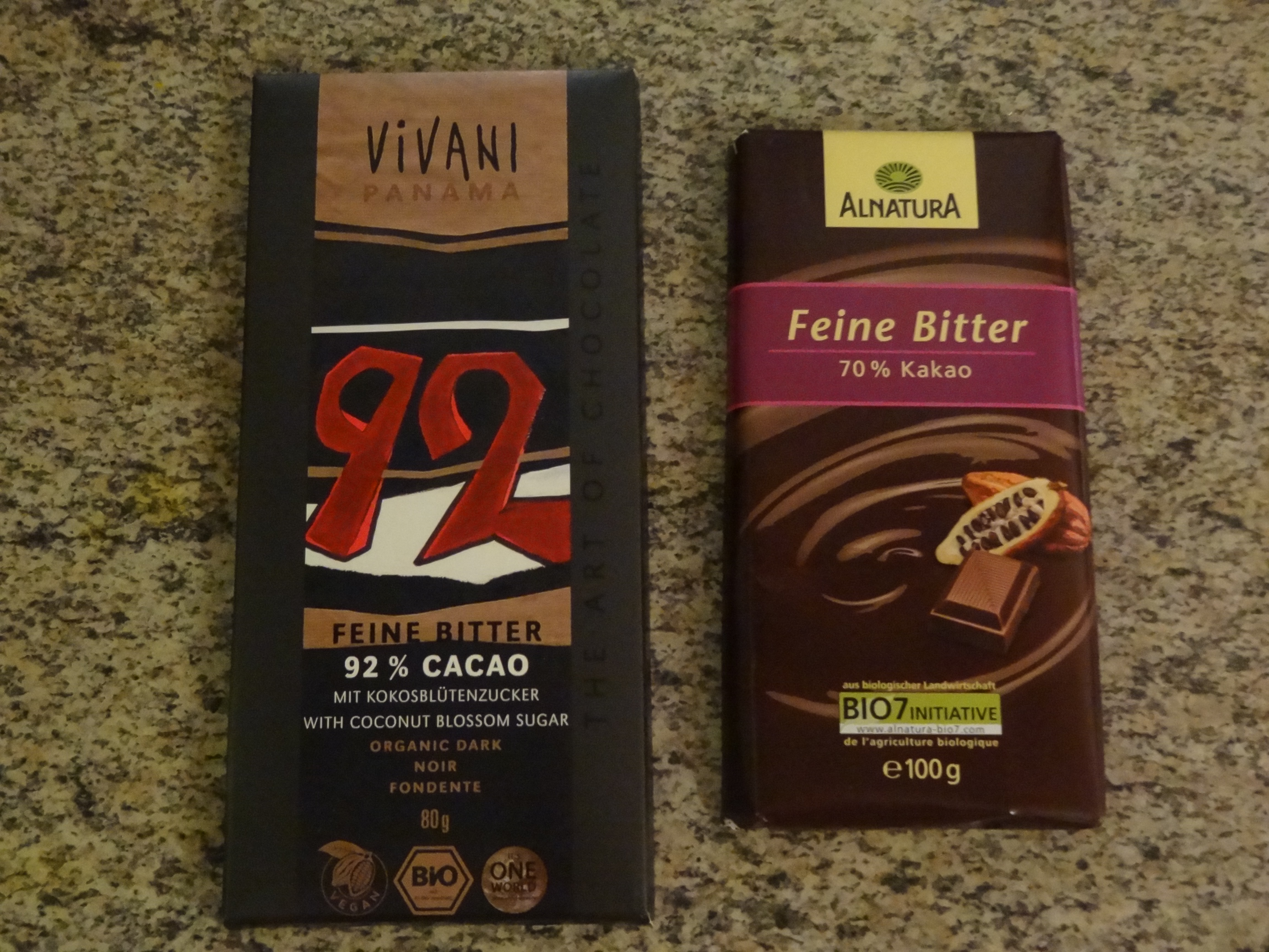 Alternativ erhältst Du auch im Bioladen oder in gut sortierten Bioregalen beim Supermarkt die etwas teurere, aber noch bessere Variante von Vivani die Bio-Schokolade mit 92% (Jahaaa – soviel!) Kakaomasse, Kakaobutter und Kokosblütenzucker.