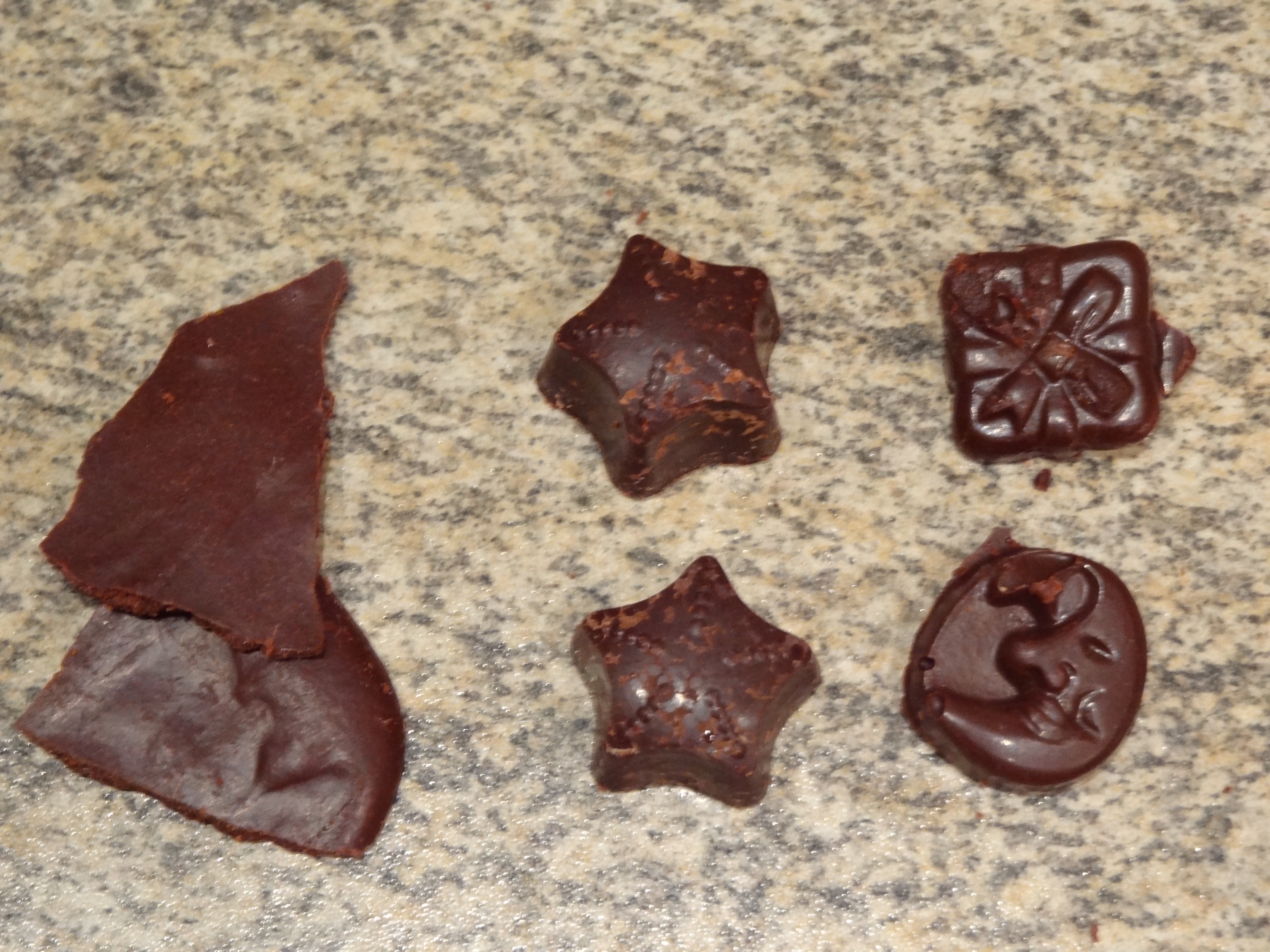 Wenn die Masse schön verrührt ist, kann sie entweder auf ein Backpapier gegossen werden, wo sie später zu Bruchschokolade wird, oder ganz fein, in eine Silikon-Pralinenform gegossen werden.