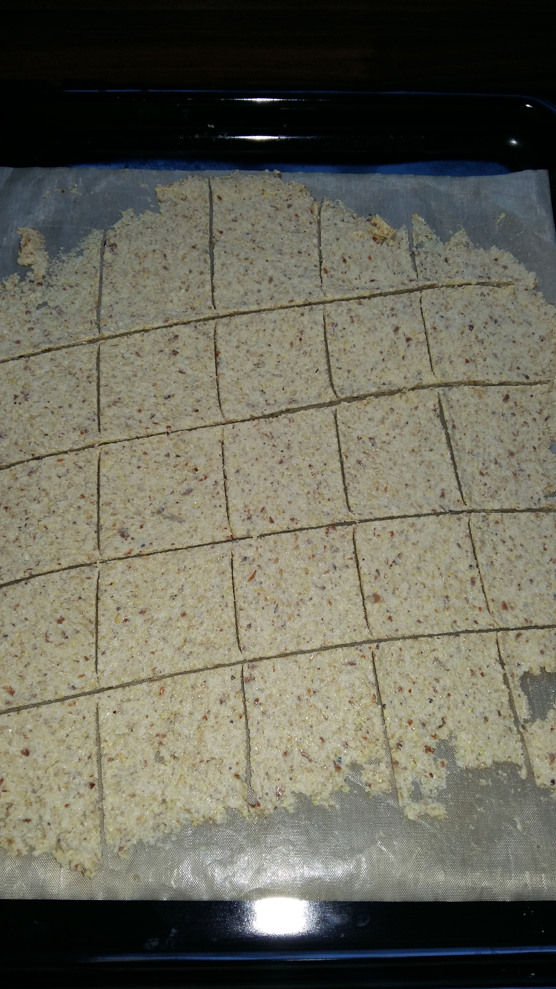 Diesen dicken Brei streiche ich auf das Backblech und schneide sofort die Portionen. Denn, wenn das Ganze erst mal durchgetrocknet ist, ist an Durchschneiden nicht mehr zu denken!