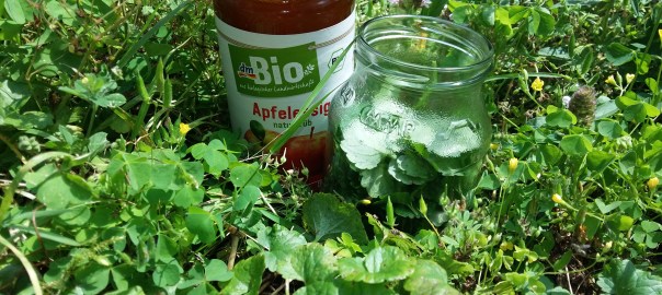 Alle Pflanzenteile müssen in der Flüssigkeit verschwinden, bevor der Deckel zugeschraubt wird und ein kleines Etikett drauf kommt. Hier schreibe ich das Kraut, Apfelessig und das Sammeldatum auf – gern auch noch den Sammelort.